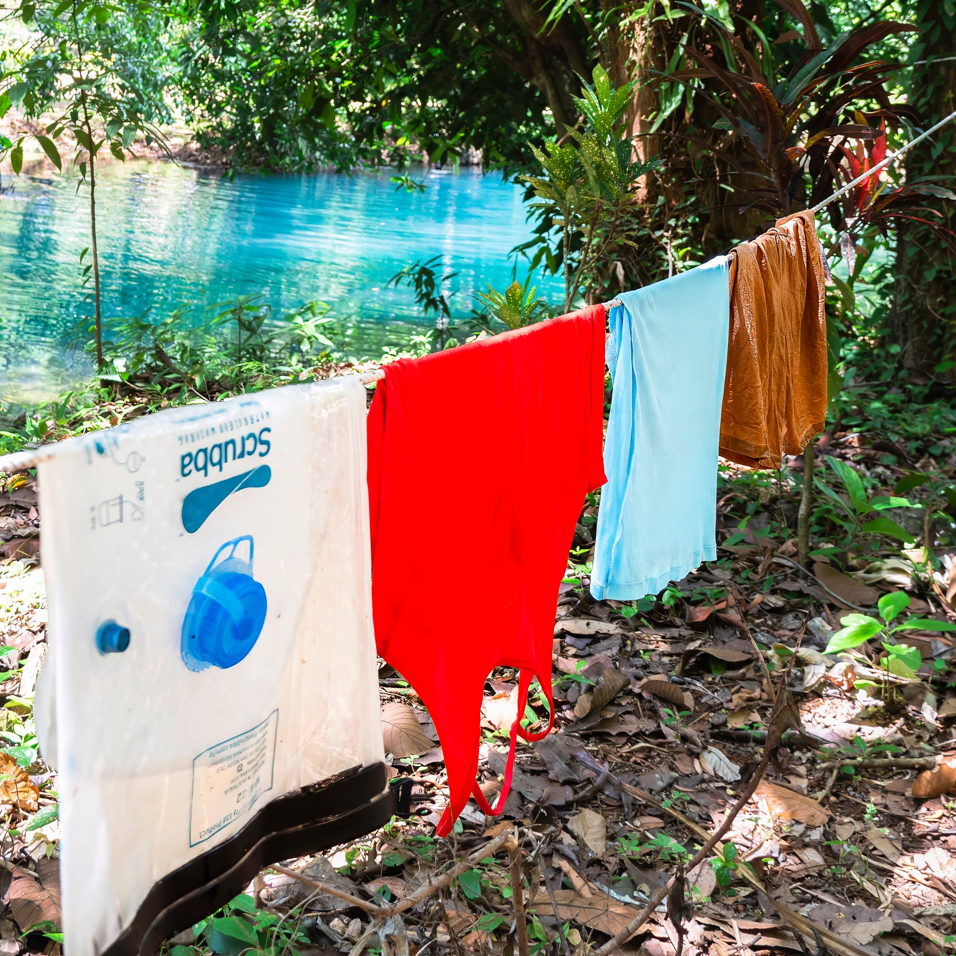 This is your complete kit for washing and drying clothes on the go. Wash your clothes with the Scrubba Waterclear wash bag. After washing, use the large Scrubba towel to partially dry them and then hang the clothes on the Scrubba elastic clothesline or one of our compact Scrubba hangers.