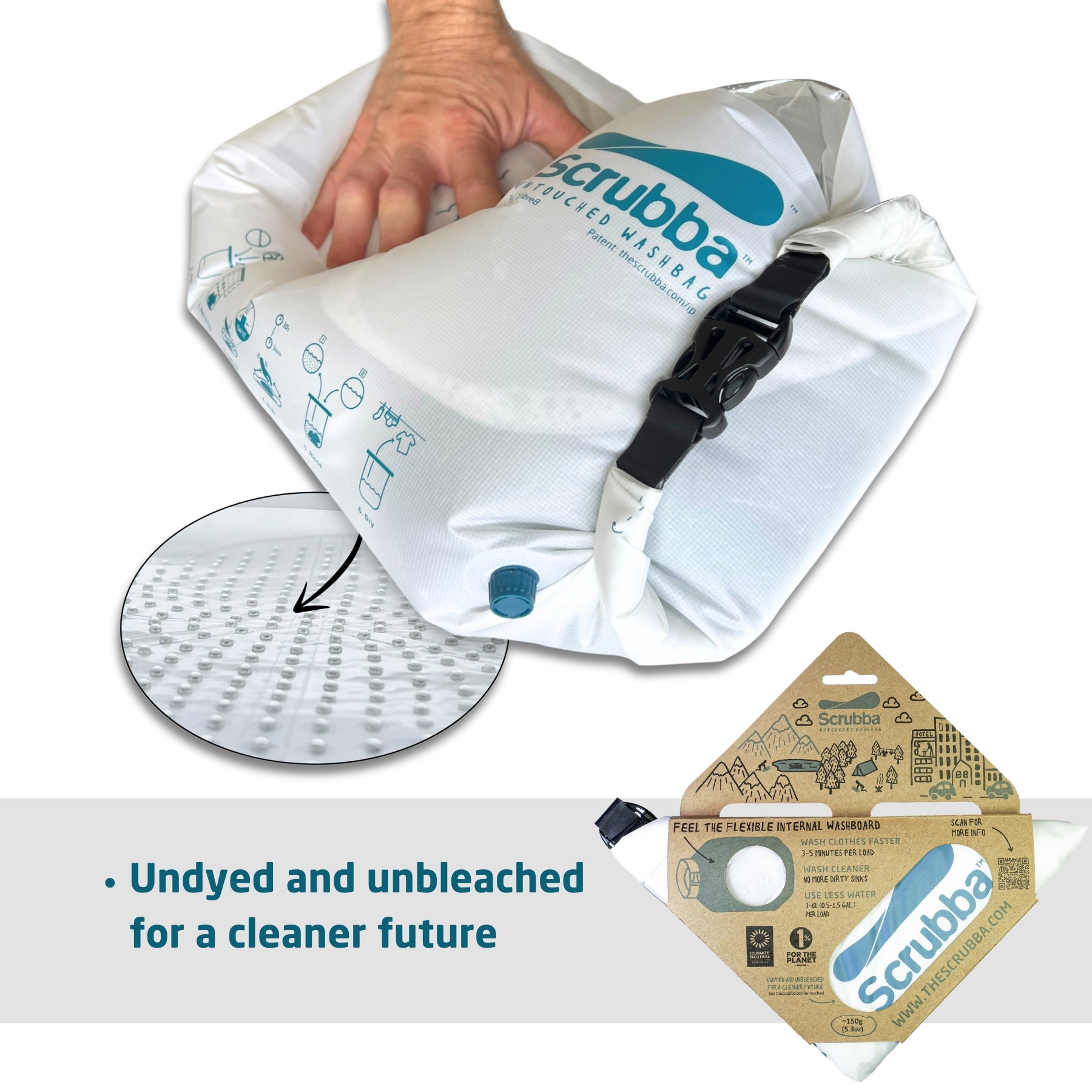 The NEW Scrubba wash bag Untouched is an undyed and unbleached version of the original Scrubba wash bag that has provided a convenient way for over 500,000 travellers and campers to pack less and clean their clothes anywhere for an even cleaner future.